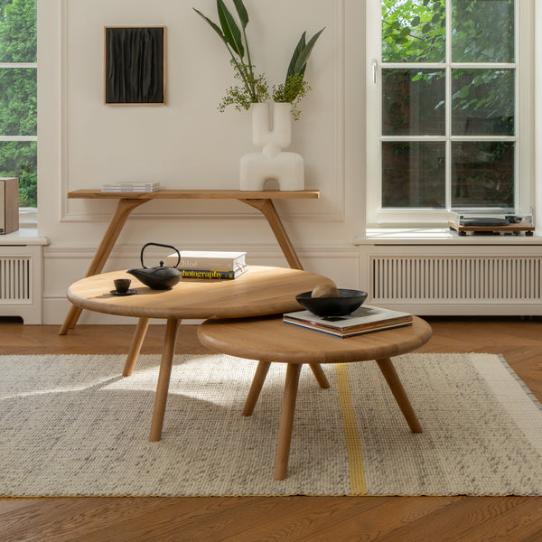 Every piece takes a circular approach—from the flowing silhouettes of the nesting coffee tables and dining tables to the gentle rounding of all edges and corners—creating a welcoming, approachable presence that works effortlessly in any space.