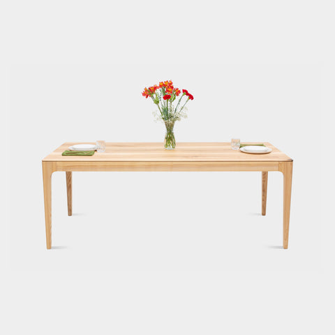 The CAROLINA Collection reimagines traditional design with curved legs and a shadow gap, giving the illusion of a floating tabletop. Offered as a dining table with optional extensions and complemented by matching benches and chairs, each piece is meticulously handcrafted by expert furniture makers using sustainable, locally-sourced materials. The minimalist aesthetic is further accentuated by the table's 1"-thick tabletop, while its solid wood frame ensures strength and durability.