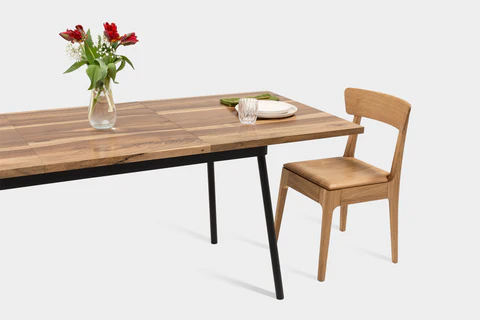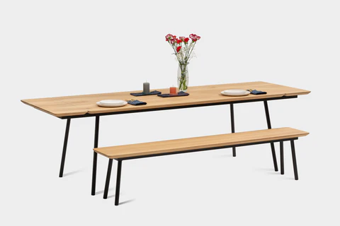 The STELLAN Collection references elements of Mid-Century Modern aesthetics. The clean lines, integration of the legs into the solid wood top, and subtle curves are hallmarks of this design period, emphasizing simplicity, functionality, and the natural beauty of materials. The curved edges of the tabletop and bench add a soft, organic touch, inspired by Scandinavian craftsmanship and minimalism. This collection blends modern practicality with timeless design principles, offering both a bench and an extendable table option for versatile functionality.